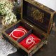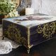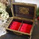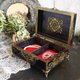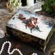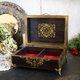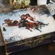 On the lid I pasted a picture with cheerful girls sledding down the mountain. The combination of black and gold adds to the festivity. Red velvet inside the box makes the item refined. The legs of the vintage box are made in the form of angels, which makes the box fragile.