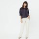 half-tucked into high-rise jeans.