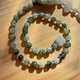 The bracelet wraps twice around the wrist, paired with small floral carvings and rounded cube beads for a gentle texture.