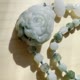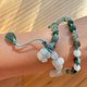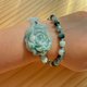 - Double-wrap jade bracelet with a blooming peony centerpiece, soft green and misty white tones, accented by floral carvings, cube beads, and a magnolia charm for elegant detail.