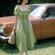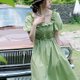 - Fabric Composition: 65% Cotton 32% Nylon 3% Spandex French court retro style, quiet and romantic French girl Fresh avocado green, square neck fungus puff sleeves, placket with multi-layer heavy pleating craftsmanship The details are time-consuming and labor-intensive, and the Sima shell buckle is decorated with embellishment, and the waist is loose and the skirt is very inclusive.