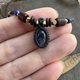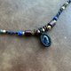 - Wax cord, copper beads, coconut shell beads, wooden beads, Lapis Lazuli, Iolite, Apatite
