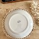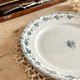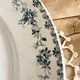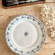 - The white earthenware has a blue-green monochrome decor. All in sobriety, this decor is composed of two friezes of floral motifs, one of which is taken up in the center of the plate. The name of the model is the one of a French city.