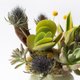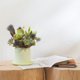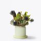 The color of this planting ceremony is bright and energetic, and it is combined with the color pot of Chunchen. The planting designer chose the plump rosette-type succulents as the visual focus, standing in the first row of the landscape with a sense of weight, as proud as the protagonist; two succulents of the same color are set aside, and the dried materials are golden succulents and thistles. As the extension of the branches, the flowers are like a support group celebrating and applauding the protagonists, and they are integrated into a lively and exciting botanical work. Put it on the window sill, on the desk, or in the shelf to add a green multi-layered display and a complete atmosphere.
