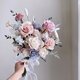 - A bouquet of preserved roses in beige, blue, purple, and white. The white blooms, pure and bright like the winter moon, shimmer with an innocent smile. The gentle beige hues, reminiscent of soft clouds in a dream, softly caress the ripples deep within the soul. The profound blue-purple tones, like mysterious eyes in the night, gaze into the memories of time.