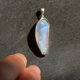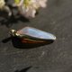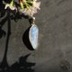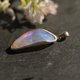 A silver pendant with a blue play of color floating on a slightly milky stone surface.