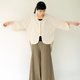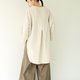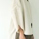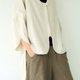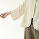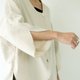 The neckline, hem, and cuffs all feature a curved cut, with an overall design of a shorter front and longer back shirt. The dropped shoulders are complemented by open tulip cuffs, creating a sleeve length of about seven to eight tenths. The back yoke also uses a large curved seam. This piece can be layered over a fitted inner top or worn on its own during spring. The buttons are the signature twisted yarn antique buttons from this collection.
