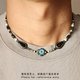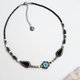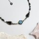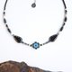 - The <Blue Flower in the Valley> handmade necklace features a meticulously designed beaded chain, with a central blue flower-shaped bead as the main element. Asymmetrical black and gold teardrop-shaped Czech glass beads on either side, paired with small beads in white, green, grey, and blue, create a subtle yet layered color scheme.