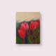 The flowers are depicted in a vibrant red, full of depth and vitality, while the leaves are a deep green with distinct veins, creating a striking contrast with the red blossoms and bringing the entire composition to life.