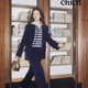 - 68% Polyester 29% Viscose 3% Spandex Polyester Navy blue anti-wrinkle processed plain weave suiting fabric 100% Polyester Dark blue mercerized jacquard lining fabric Black resin custom LOGO buttons Navy blue invisible zipper