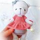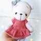 Materials: acrylic/ wool yarn; cotton for sweaters, dresses and bodysuits; holofiber; safe eyes.