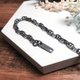 - Drawing inspiration from anchor chains, the design features interlinked rings with welded crossbars, blending a nautical essence with sharp, angular lines. Handcrafted, the sterling silver is treated to achieve a vintage patina, resulting in a bracelet with a deep, subdued character.