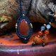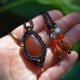 - Carnelian, with its striking deep red hue. When held up to the light, its redness emerges with even greater transparency, making it a recommended stone for those seeking a truly crimson gem. Adorned with brass beads, it has been crafted into a compact pendant.