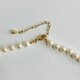 This is a Japanese-made shell pearl necklace made of raw shell beads that have been painted with multiple layers of original color pearl paint. It is finished with an all-knot process, with knots carefully tied between each pearl. The pearl color is a cream two-tone color with a fine texture and gentle luster. The two-tone color is toned with a subtle gradation in mind. The pearl size is just under 6mm in diameter, and the length is about 60cm, a matinee size that can be worn loosely over clothes. There is an adjuster at the tail end, so it can be extended by about 5cm.