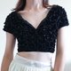 เสื้อครอปปักลูกปัดกำมะหยี่สีดำสไตล์วินเทจ เสื้อครอปสำหรับใส่ไปงานราตรี