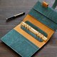 Equipped with pockets on both the left and right sides, and a pen holder on the right.
