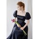 The square neckline and cinched waist highlight a feminine silhouette,