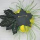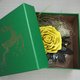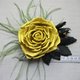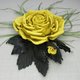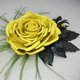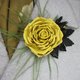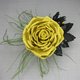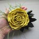 A vibrant and luxurious rose crafted from genuine leather. Decorated with fluffy ostrich feathers, dark green iridescent leaves, and two buds.
