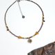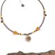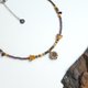 - The <Warm Autumn Sunshine> handmade necklace features low-profiled brown-purple and amber glass beads strung together, with a central circular floral pendant resembling a small sun, exuding a warm and calming aura. Floral glass beads on either side are accented with yellow and light blue, bringing out a vintage count style and a touch of bohemian flair.