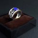 - Rock and soil textured sterling silver band ring, featuring one Lapis Lazuli cabochon. Size US8.