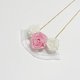 A gold metal plate is attached to the back of each white rose and connected to a chain.