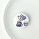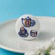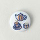 - A charming embroidered brooch featuring a tea set in refreshing shades of blue. The teapot, teacup, and sugar pot are simply embroidered in two colors: blue and orange.