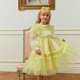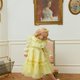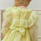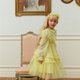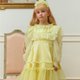 Delicately sparkling aurora-colored sequin beading, chiffon fabric that changes hue with the light, soft scallop lace, and metallic yarn with gentle pearls—all these materials harmonize perfectly, creating a more luxurious and special mood. The lace trim and flowing frill details capture a bohemian chic sensibility, while the adjustable waist with a large back ribbon ensures a comfortable yet elegant silhouette. The dress is a 100% clear lemon yellow, giving a refreshing feel reminiscent of lemonade.