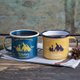 Polish designer Jordi Trias has created a series of enamel mugs in a natural, scenic style. The front of the mug features a mountain motif, complemented by a striking blue and yellow color combination. The base includes a compass rose with charming icons of a tent, flame, and tree.