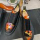 An obi sash with a plum blossom pattern in black, gold, and orange is featured on the heel.