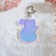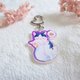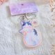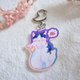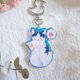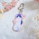 A holographic acrylic keychain that appears light blue or pink depending on the angle.