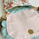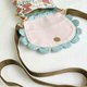 Materials: Pure cotton floral fabric, light pink marled cotton, light green speckled fabric, light green quilted cotton, khaki webbing, gold clasp, gold magnetic snap, YKK metal zipper.
