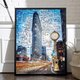 - New York City Art: Flatiron Building Mosaic / Collage / Poster Print, Twilight Scene with Lights & Clock A classic NYC street scene captured in black and white, featuring a weathered stop sign and a one-way sign against a backdrop of towering buildings. Perfect for adding a touch of urban grit to any space.